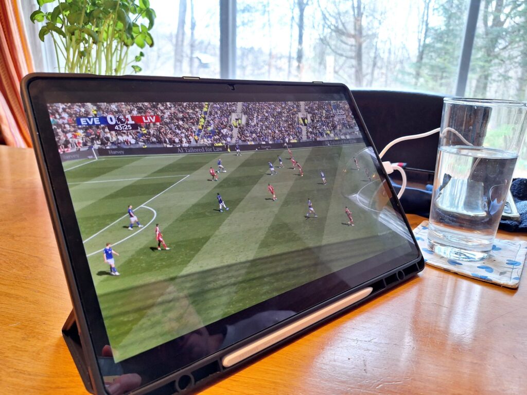 Galaxy Tab S10+に搭載されている有機ELディスプレイは、とにかく発色が鮮やかです。芝生の深い緑や選手の動きがくっきりと再現されます。サッカーファンのクリスもその画像クオリティに大満足。